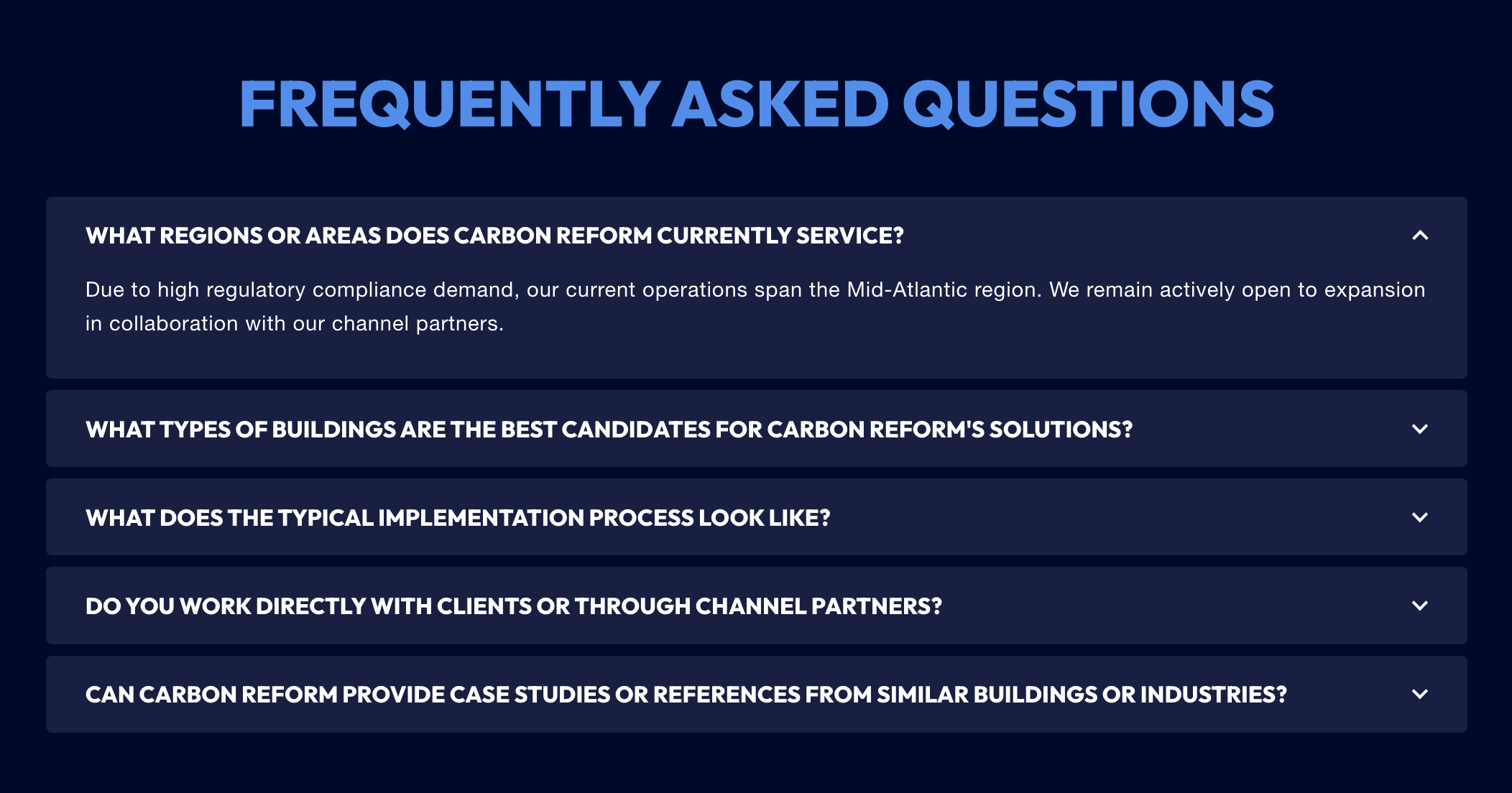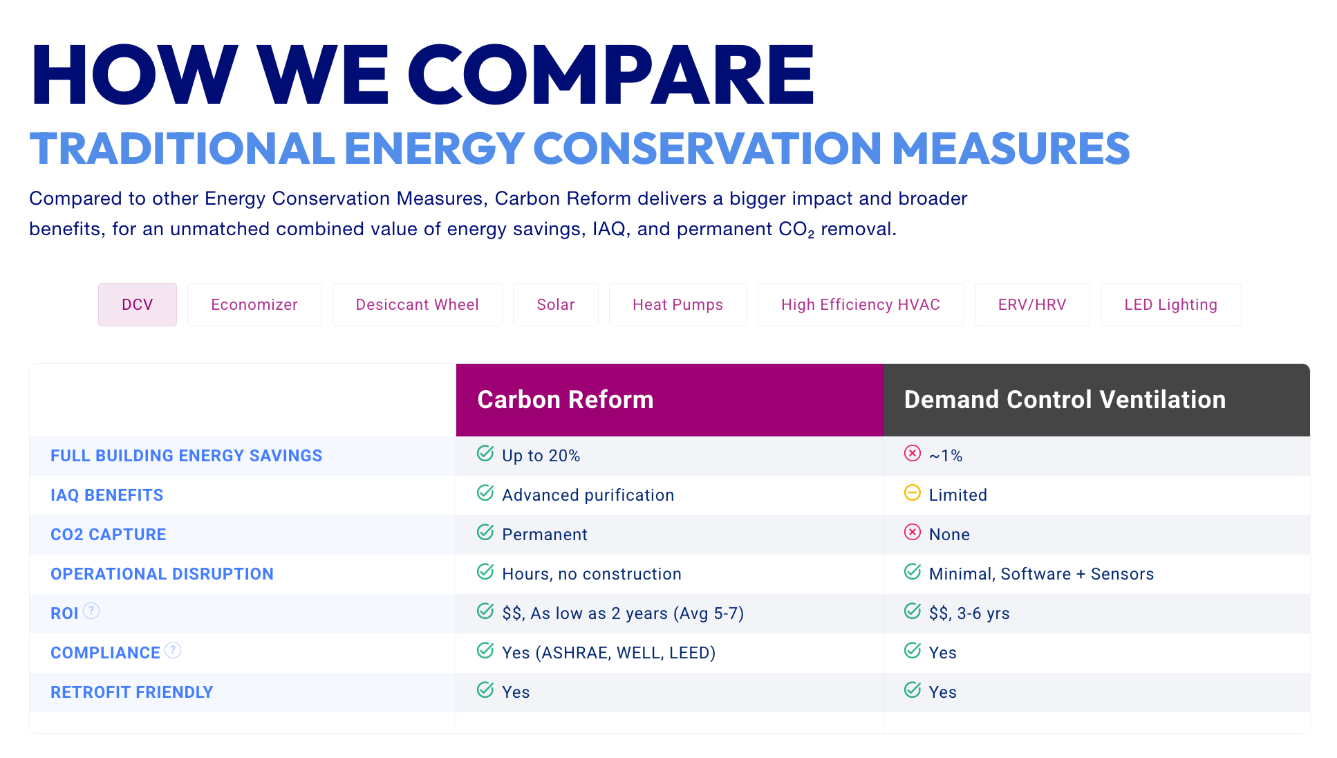 I also wanted to address how buyers were already thinking about solutions. Instead of comparing Carbon Reform only to direct technical competitors, I built a “How We Compare” framework that maps the technology against familiar options like solar and other energy efficiency measures. Using tabbed comparisons, I helped prospects evaluate a first-of-its-kind category alongside the alternatives they were already considering, making the technology easier to contextualize and justify internally.